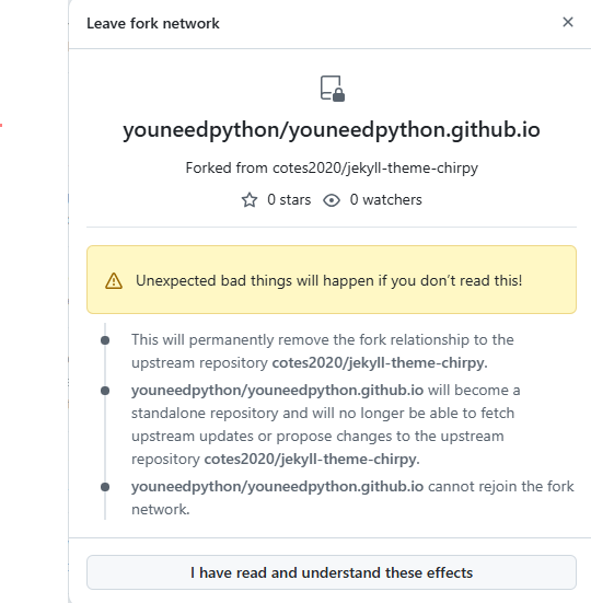 Leave fork network 창이 뜨면, 하단에 있는 I have read and understand these effects 버튼 클릭
