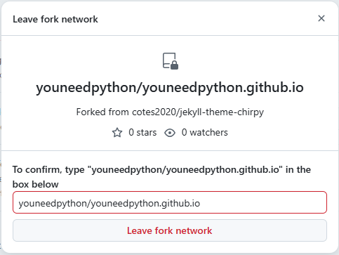 GitHub는 확인을 위해 저장소 이름을 입력하고, 아래에 있는 Leave fork network 버튼 클릭